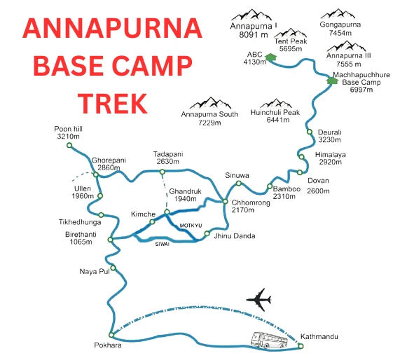 The Annapurna Base Camp (ABC) Trek takes you through a bunch of really different places, from warm, green lowlands to super high, snowy mountains. Each spot has its own vibe, its own height above sea level, and its own culture. They all play a part in This amazing adventure. Here's a rundown of the places you'll hit on the classic route, the one that goes via Ghorepani/Poon Hill (everyone wants that sunrise view!) and then down to Chomrong and up the Modi Khola river to ABC. Keep in mind that the elevations are rough guesses, based on maps and guides. The descriptions try to capture what makes each place special.